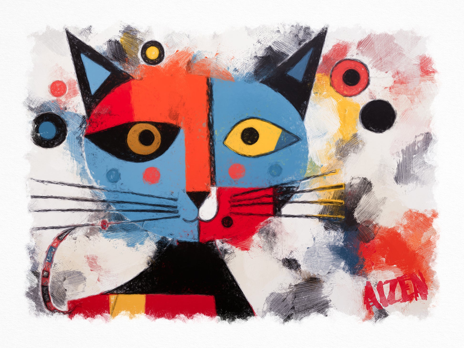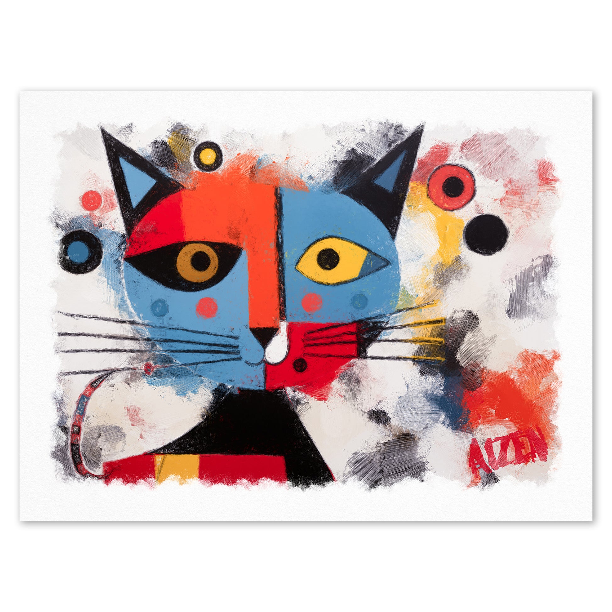 "Here Kitty Kitty" is an imaginative digital painting from Art by AIZEN that captures the whimsical essence of feline curiosity with a vibrant, abstract twist. This piece juxtaposes bold primary colors with stark whites and deep blacks, creating a playful and intriguing representation of a cat with a dual-toned face. The one yellow and one blue eye are emblematic of the unique and often mysterious nature of our feline companions.