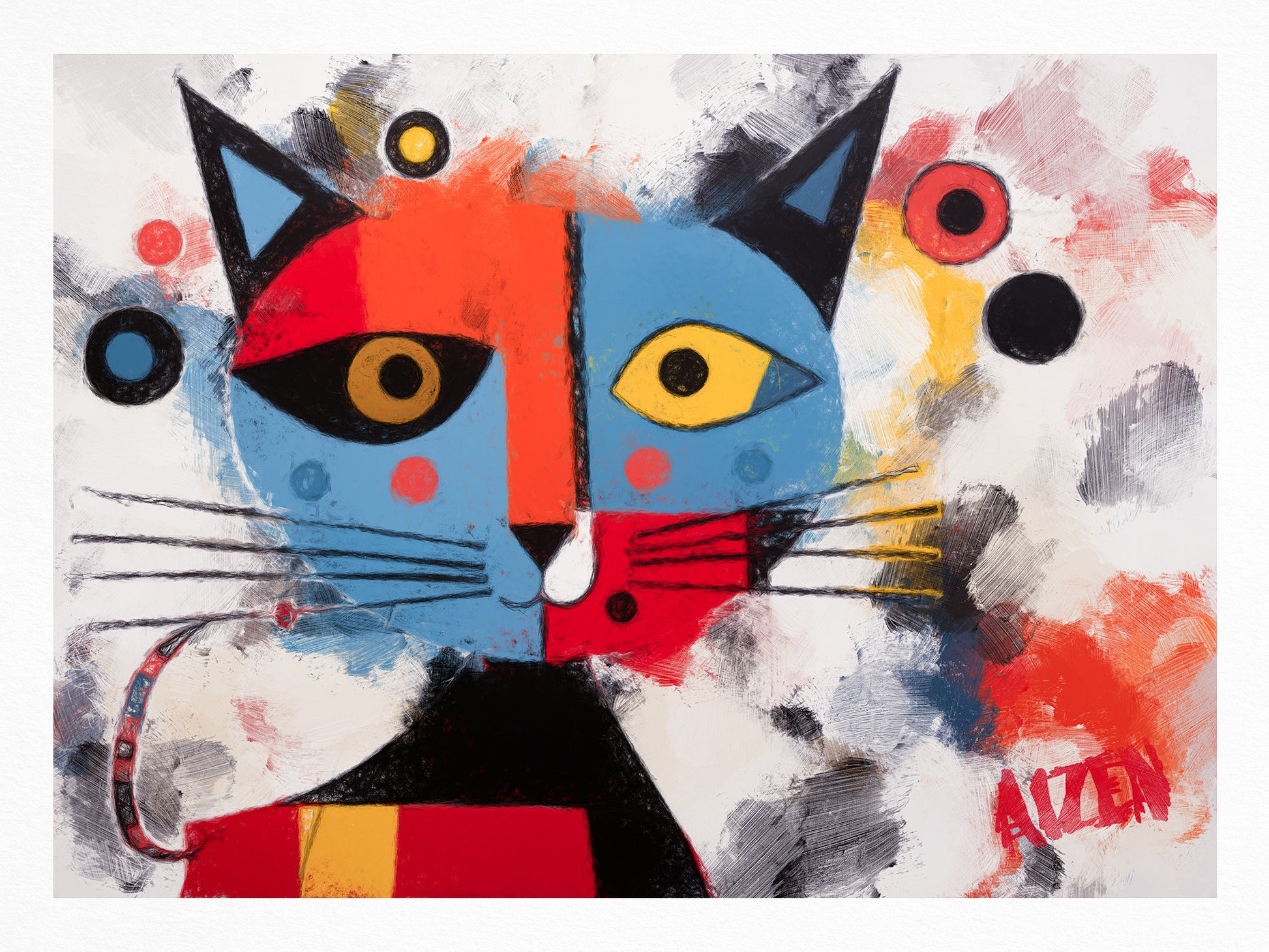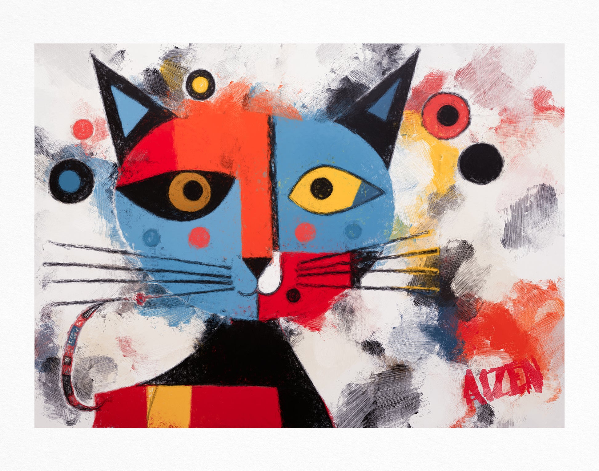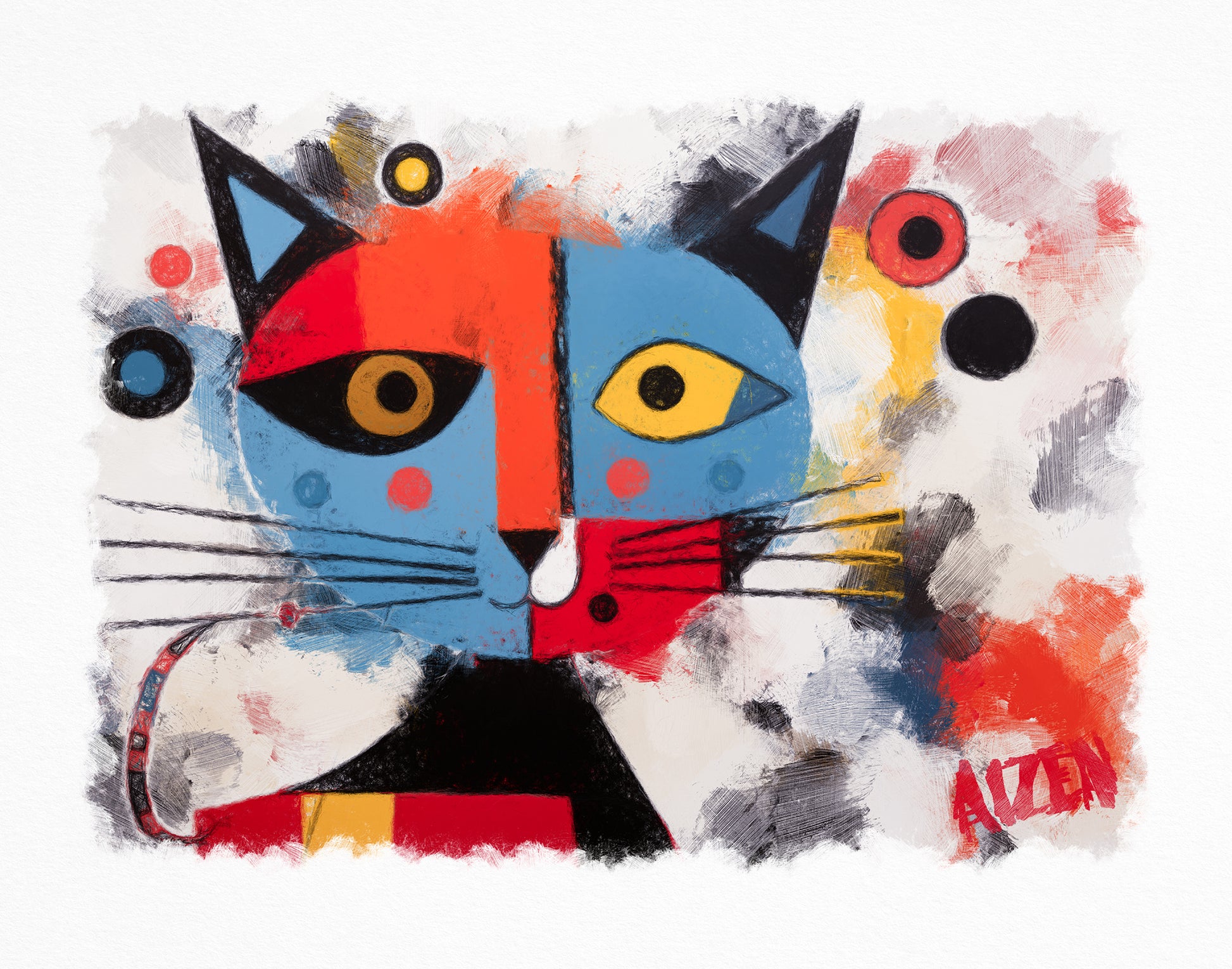 With "Here Kitty Kitty," Art by AIZEN invites the viewer to engage with the canvas in a light-hearted dialogue, one that reflects the joy and color that pets bring into our lives.